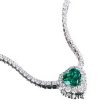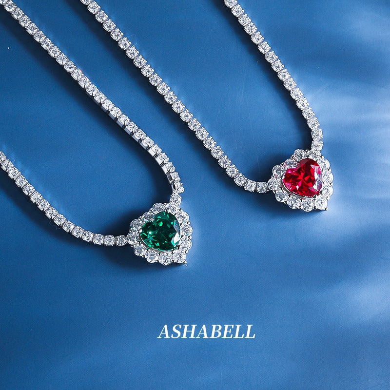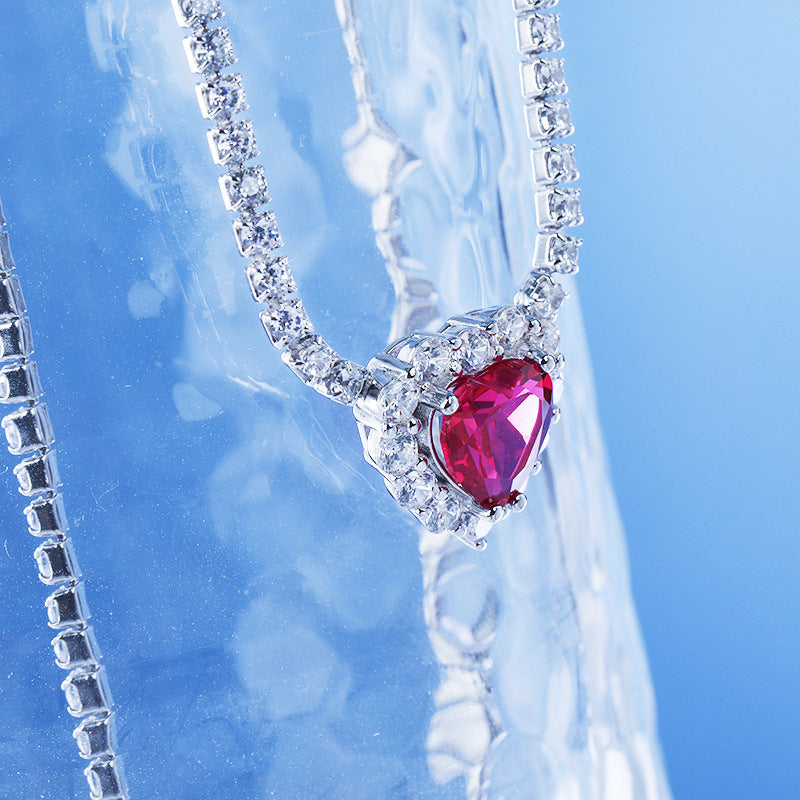 925 Sterling Silver Ice Cut Tennis Chain Shining Big Red Stone Emerald Heart Shaped Necklace