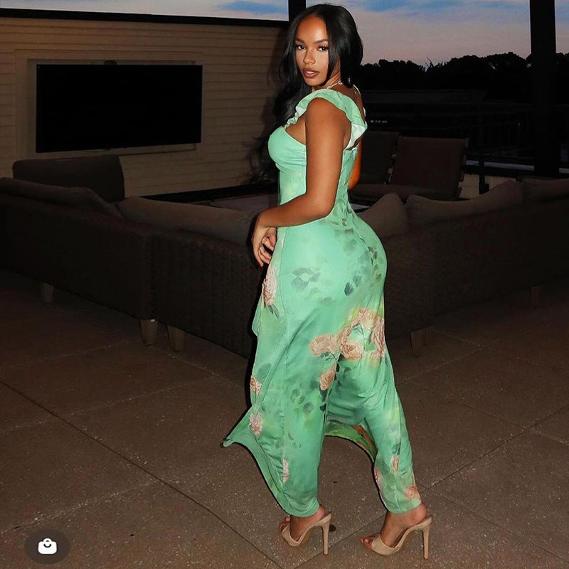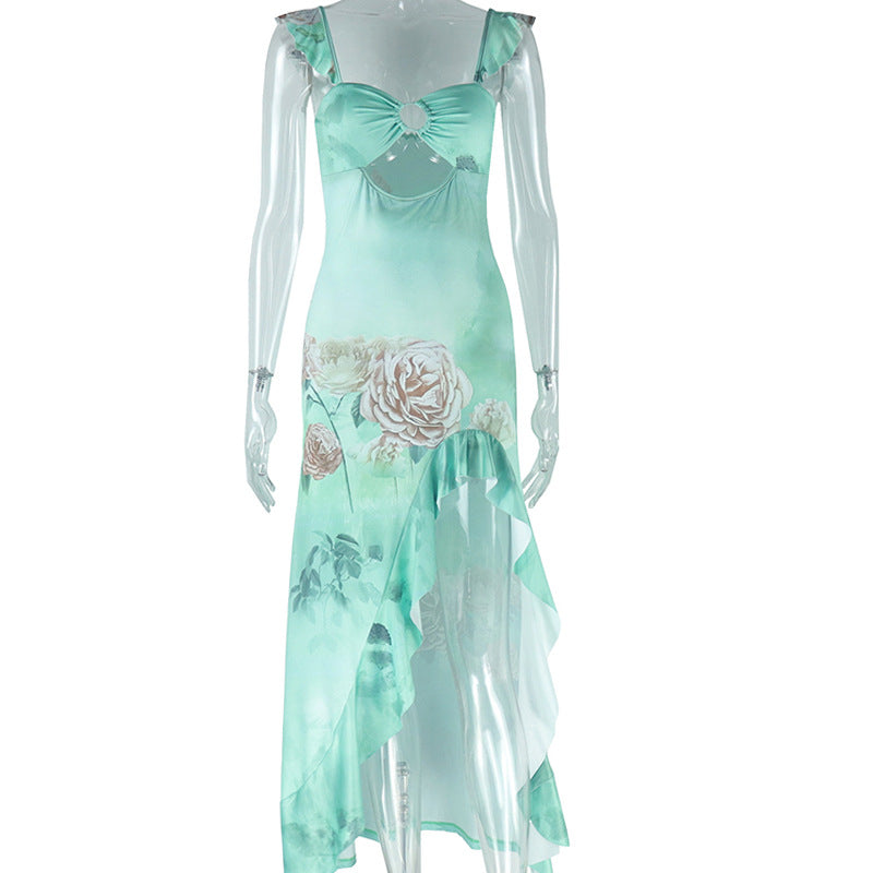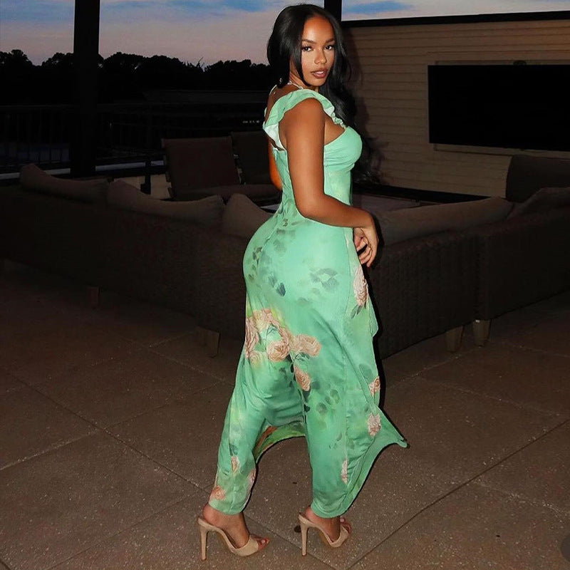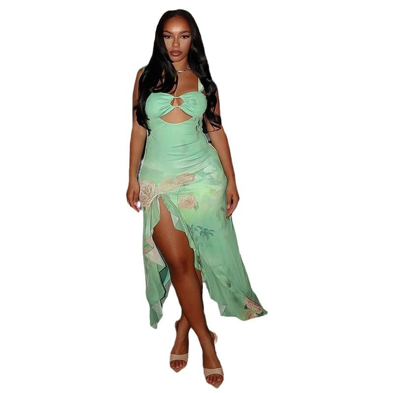 Sexy suspender chest wrapped sleeveless slit ruffled skirt